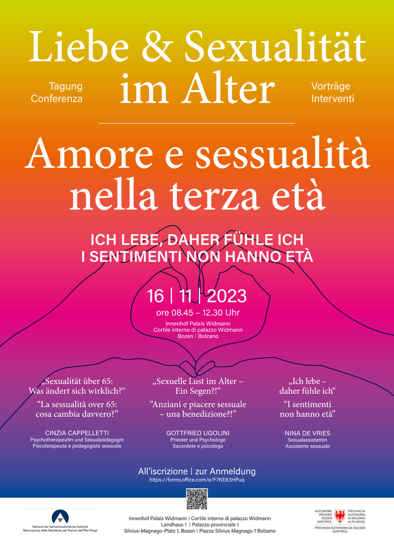 stattfindet. Nach Grußworten von Landesrätin Waltraud Deeg und der Präsidentin des Verbandes der Seniorenwohnheime Martina Ladurner folgen drei Referate sowie eine Diskussionsrunde mit den Referierenden. Psychotherapeutin und Sexualpädagogin Cinzia Cappelletti, Priester und Psychologe Gottfried Ugolini und Sexualassistentin Nina De Vries gehen dabei auf unterschiedliche Aspekte des Themas von Fachreferentinnen und -referenten ein. Moderiert wird die Veranstaltung von Jutta Wieser, es ist eine Simultanübersetzung vorgesehen.