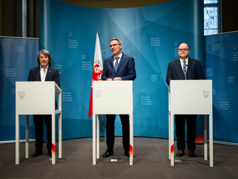 - Gesundheitslandesrat Hubert Messner (1.v.l.) und Landeshauptmann Arno Kompatscher (Mitte) haben heute (12. März) den neuen Generaldirektor des Sanitätsbetriebes Christian Kofler (1.v.r.) vorgestellt. (Foto: LPA/Fabio Brucculeri) » [IMG 3 MB]