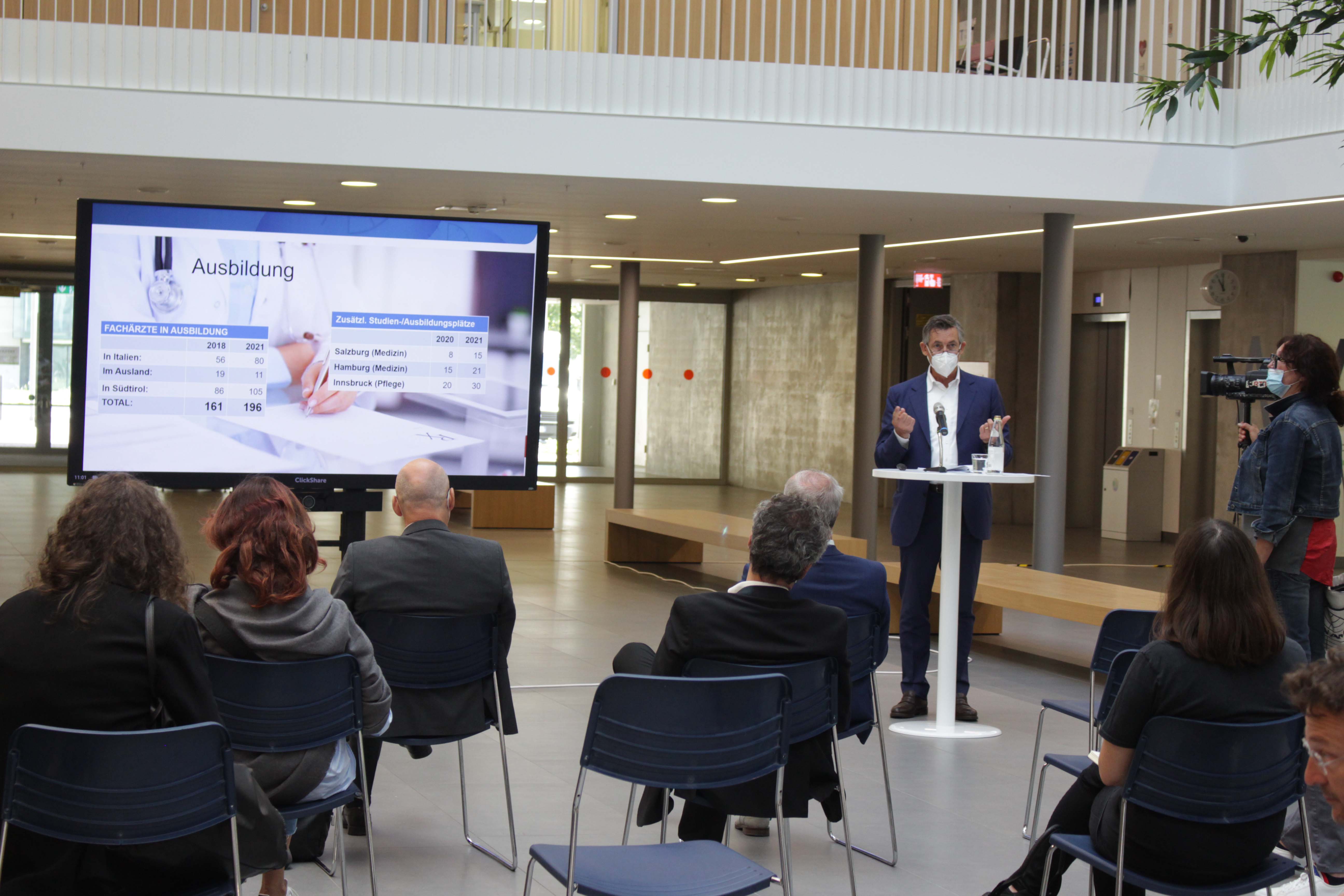 Landesrat Widmann hat heute bei seinem #halbzeit-Gespräch am Sitz der neuen Klinik in Bozen vor allem auf die Errungenschaften im Gesundheitsbereich zurückgeblickt. (Foto: LPA/Michela Antino)