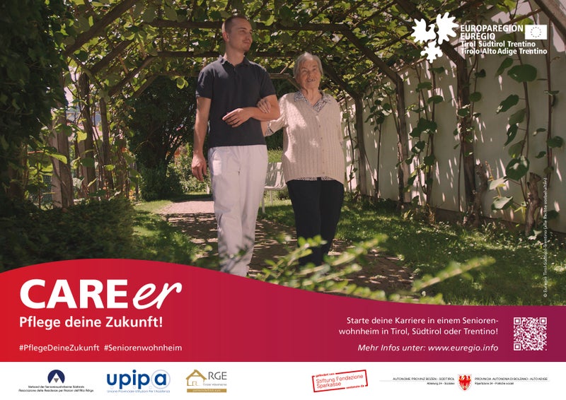 "Care" bedeutet auf Englisch Pflege und "Career" steht für Karriere oder Laufbahn. Dieses Wortspiel nutzt die Europaregion Tirol-Südtirol-Trentino, um mit einer breiten Kampagne die Pflegeberufe ins Scheinwerferlicht zu stellen. Mit Kurzfilmen, Plakaten und weiterem Informationsmaterial wird nicht nur auf die gesellschaftliche Bedeutung der Pflegeberufe hingewiesen, sondern auch auf viele andere Gründe, die für eine Arbeit in der Pflege sprechen. "Die gemeinsame Kommunikationskampagne zielt darauf ab, das Image und die Attraktivität der Pflegeberufe zu stärken und deren Wert hervorzuheben sowie für junge Menschen und Arbeitssuchende für diesen Berufsweg zu begeistern", heißt es aus dem Euregio-Büro.