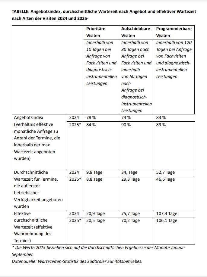 - Datenübersicht zu den durchschnittlichen Wartezeiten nach Angebot und effektiver Wartezeit nach Arten der Visiten 2024 und 2025 im Südtiroler Gesundheitswesen. (Quelle: LPA/ Südtiroler Sanitätsbetrieb) » [IMG 106 kB]